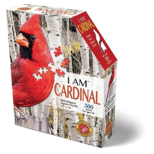 Casse-tête en forme de cardinal et affiche de référence avec des anecdotes amusantes sur l’oiseau.