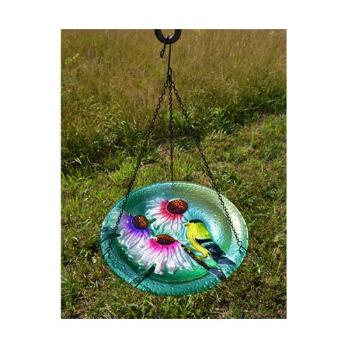 Bol en verre texturé, 13" (33 cm), 3 chaînes métalliques, hauteur suspendue 18" à la fois décoratif et utile pour offrir de l’eau fraîche aux oiseaux.