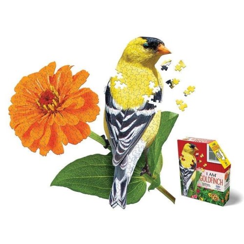 Casse-tête en forme de chardonneret jaune, 14 x 24 po et affiche de référence avec des informations sur l’oiseau.